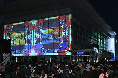 As the surroundings grew darker, everyone in the venue counted down to the first projection mapping show. An eight-minute main video was projected onto the distinctive wall of Tokyo Big Sight. Set to music that was sometimes dynamic, sometimes lighthearted, the video combined Tokyo's tradition and innovation, vibrant athletes, and the Olympic flame, building anticipation for the Games.
