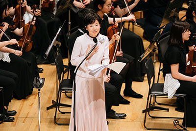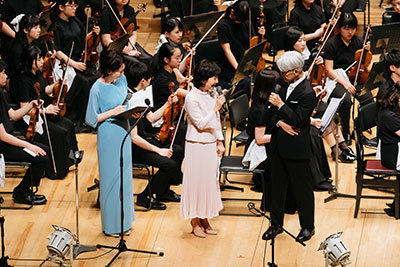 Actress Sayuri Yoshinaga recited five poems by Tohoku-born poets, including Takuboku Ishikawa's "Airplane," Kenji Miyazawa's "Work No. 1004," and Mieko Kasai's "Journey." She exchanged a firm handshake with Mr. Sakamoto "I'm so happy to be together like this again. I think Mr. Nagata Hiroshi's poem 'The Big Tree' was written about you," she said with a smile, drawing loud applause from the audience. She also praised the performance, stating, "The orchestra members are steadily progressing. Especially 'Symphony No. 2' is a piece that gives courage to those suffering in Tohoku."