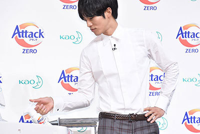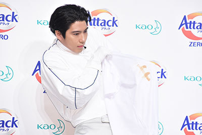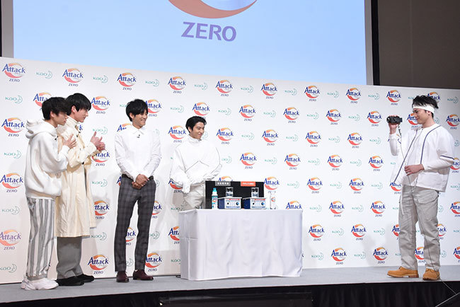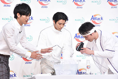 The five actors appeared on stage wearing the outfits from the commercial and conducted a cleaning power comparison experiment between the new product and the previous one. As Kaku, who played the character "Science Maniac Who Loves Experiments," washed the dirty cloth, everyone reacted with wide eyes, exclaiming "Wow!" and "Amazing!" Matsuzaka commented, "I often wear T-shirts on set this time of year. It's really helpful that the cleaning power is this strong."