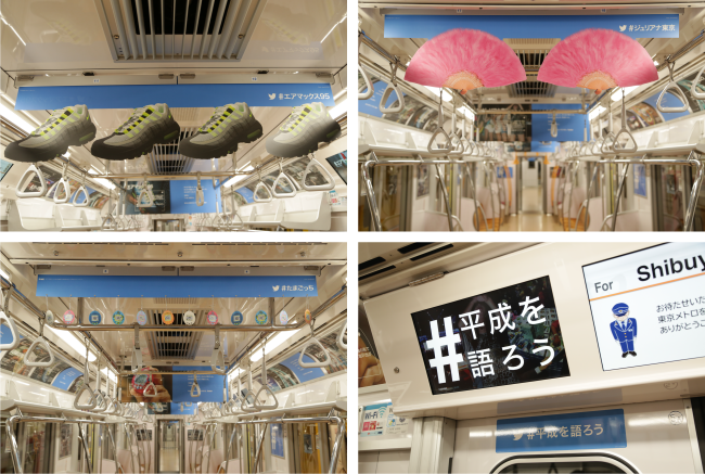 The hanging posters feature the campaign copy: "We talked together. We laughed together. We debated together. We connected together. Everyone's 'now' was the Heisei era. Let's talk about our 'now' in Reiwa too." They also showcase some of the campaign keywords, photos, and tweets. Furthermore, special hanging posters featuring life-size, photorealistic prints of objects symbolizing the Heisei era are capturing passengers' attention.