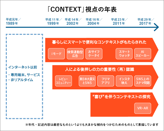 As we've seen this time, our daily lives have become smarter and more convenient by incorporating various services through information media, especially the internet, thereby expanding "context." We've also gained access to information enabling rational, situation-specific choices and reliable word-of-mouth recommendations (though their misuse sometimes becomes a social problem).