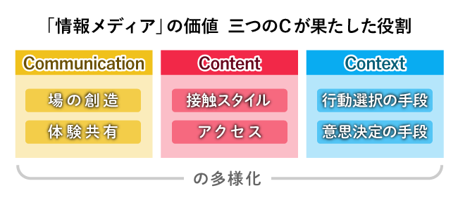 Parts 3 through 5 (this installment) of the series explore the value (wealth) information media has brought to our society over the 30 years of the Heisei era, using three "Cs" – Communication, Content, and Context – as key interpretive lenses.