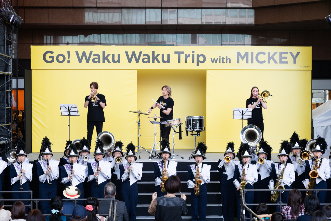 At the welcoming ceremony at Kagoshima Chuo Station, members of Disney's entertainment show "Blast! The Music of Disney" and the local Kamimura Gakuen Wind Ensemble performed the "Mickey Mouse March." Their powerful performance drew loud applause from the audience.
