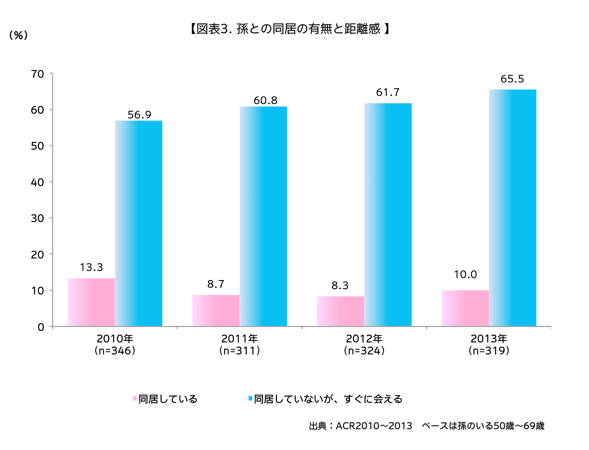 As women increasingly enter the workforce and dual-income couples become more common, the need for regular grandparent support in daily life is growing. As of 2017, only about 10% of grandparents lived with their grandchildren. However, when including those who live nearby and can see their grandchildren easily, approximately 75% have regular contact with their grandchildren. Notably, since 2017, the trend of living nearby shows a clear increase (Figure 3). Grandparents are also reliable support figures for childcare.