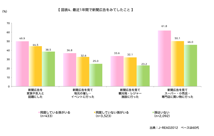 Furthermore, people with grandchildren may exhibit more active consumption behavior compared to those without. In terms of "actions taken after seeing newspaper ads in the past year," the percentage of various responses is higher. Communication with grandchildren may be driving increased consumption (Figure 4).