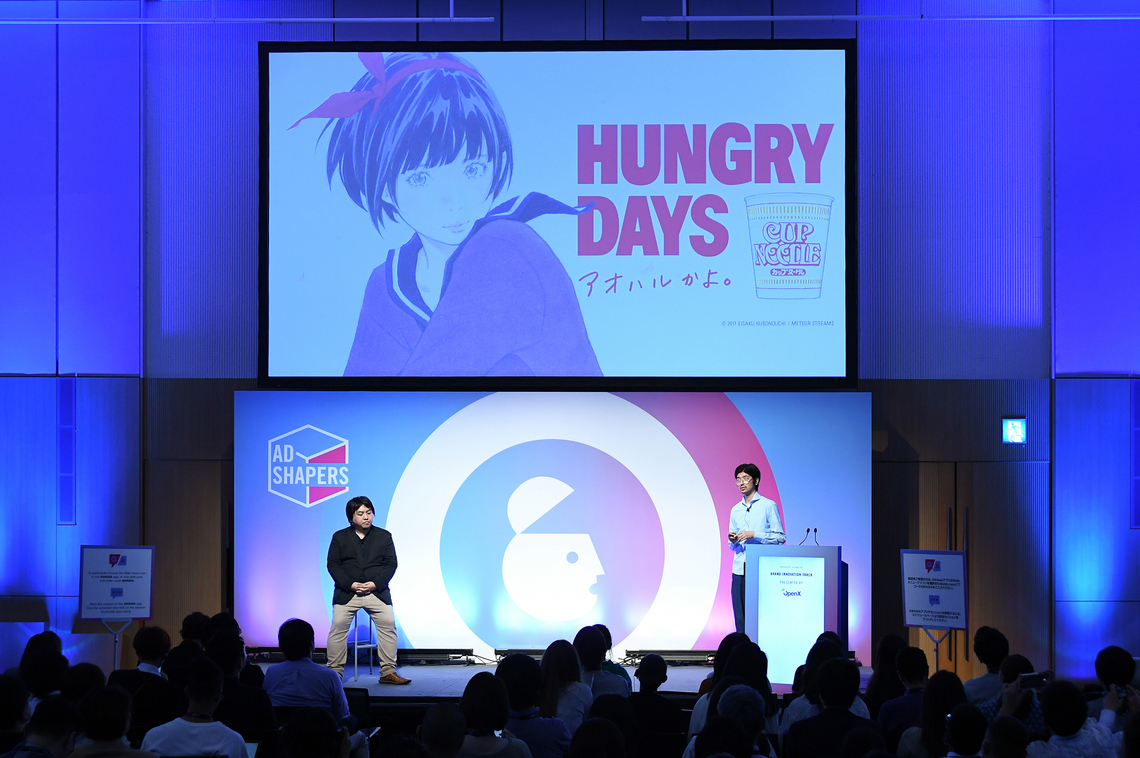 As an example of adapting to a hyper-consumption society (where trends quickly become stale), he showed the "HUNGRY DAYS" CM series for Cup Noodles. He demonstrated how to create ads that aren't easily consumed by repeatedly devising mechanisms that become topics in online news.