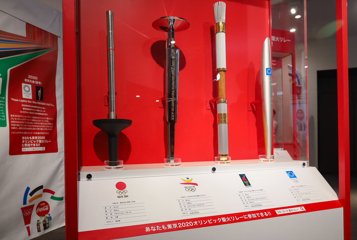 A corner showcasing the company's history of Olympic partnerships was set up at the venue, displaying actual Olympic torch relay torches used in past Games, including the 1964 Tokyo Games.