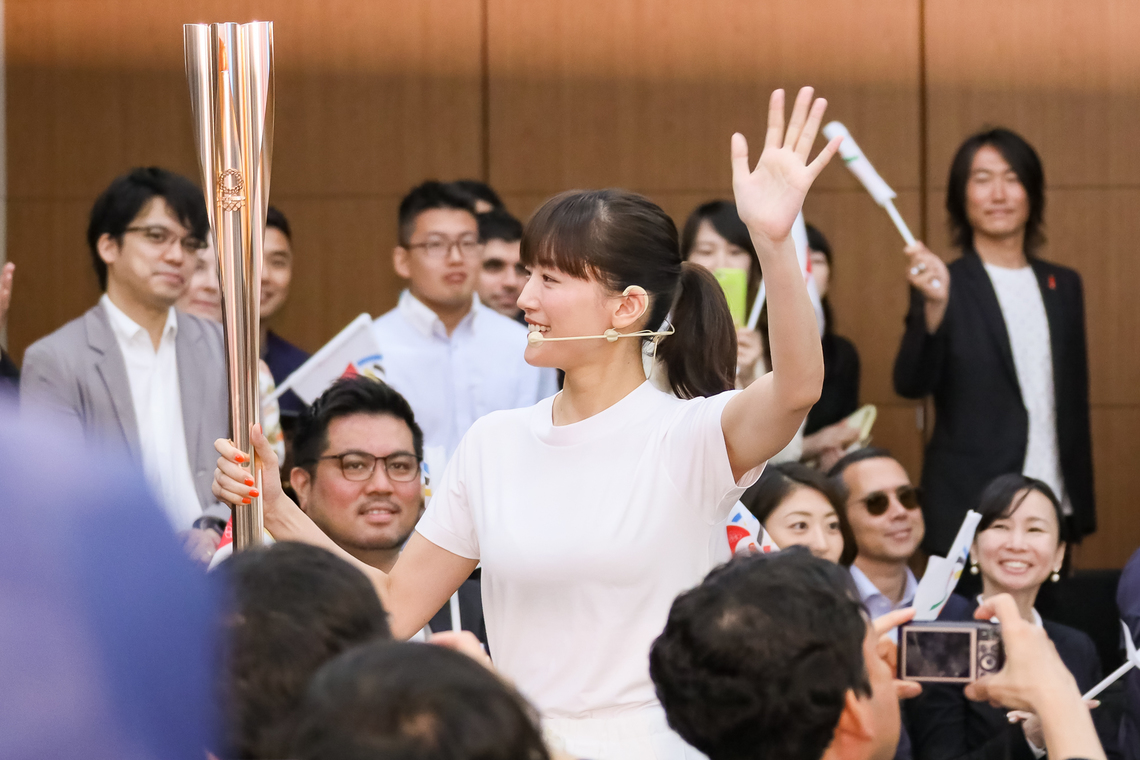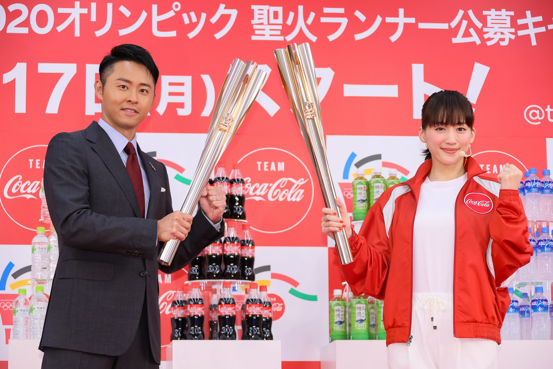 At the "TEAM COCA-COLA AMBASSADOR" appointment ceremony, actress Haruka Ayase, who appears in TV commercials, joined Kitajima to demonstrate the "torch kiss" – where torchbearers touch their torches together to transfer the flame.