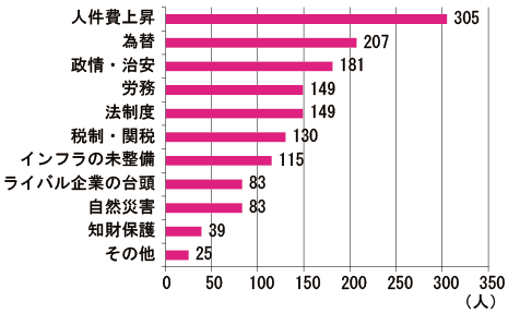 The most frequently cited risk factor (multiple answers allowed) for Japanese companies in their host countries/regions was "rising labor costs" (305 respondents), accounting for over two-thirds of the total. Wage issues are a major concern, as they erode the cost advantage—one of the biggest benefits of expanding into Asia. Background factors cited included "labor shortages" (China), "frequent strikes" (Indonesia), and "legislation on minimum wages" (Malaysia). Many companies expressed distress, stating "labor costs are rising about 10% annually" (China) and "wages are becoming comparable to Japan's" (Hong Kong).