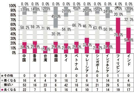 Regarding economic outlook by country/region, the Philippines had the highest percentage of respondents expecting "improvement" (76%). Reasons included "It's attracting global attention, and foreign capital inflows will likely increase," and "It seems more mid-sized and larger local corporations are being established," reflecting a tangible sense of the favorable economic situation. India also exceeded half at 55%. Outside the Philippines, ASEAN countries showed subdued "improve" responses ranging from 20% to 35%. In Indonesia, facing general and presidential elections, negative opinions like "impact is unpredictable" were prevalent, with "deteriorate" (25%) being the highest in ASEAN.