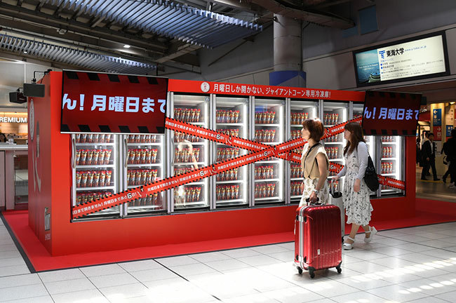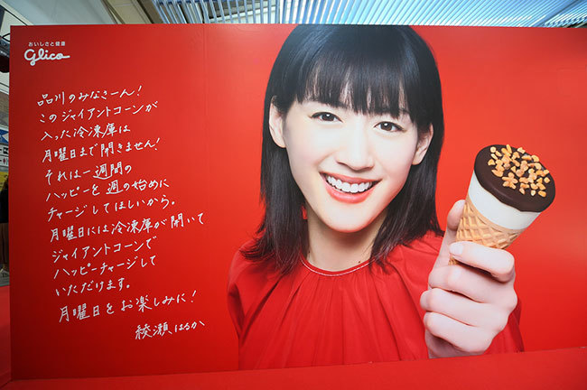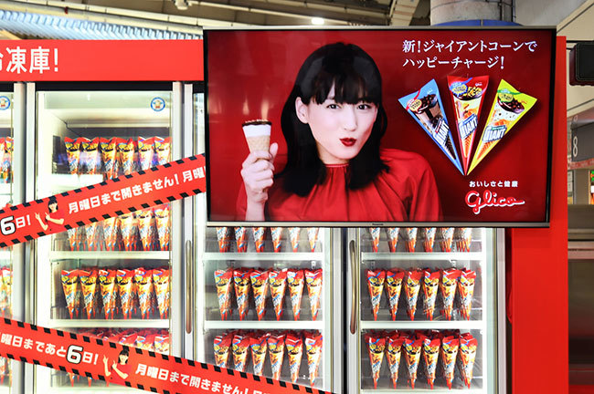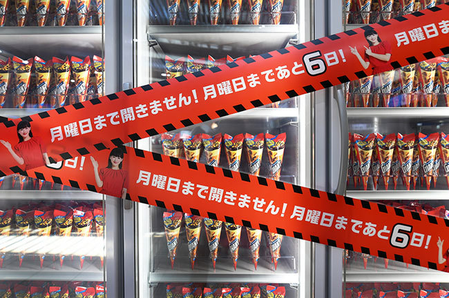 Inside the refrigerator installed on the 25th, Giant Corns are neatly displayed, but tapes with countdown messages like "Closed until Monday! Only 6 days left until Monday!" are affixed. Additionally, handwritten messages and videos from Ayase call for Happy Charge, drawing the attention of people passing through the station.