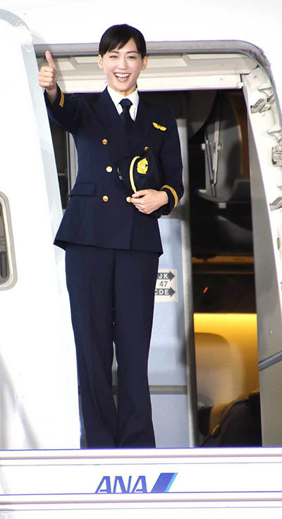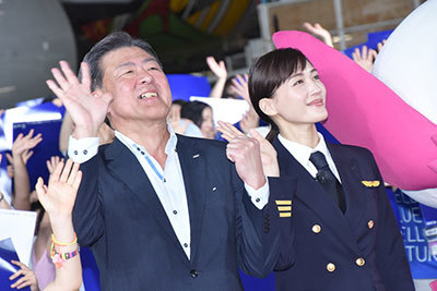 Actress Haruka Ayase, dressed in a pilot's uniform, appeared from the boarding stairs of the specially painted "HELLO 2020 JET" (B777-200 model) parked at the terminal, drawing cheers from the crowd.