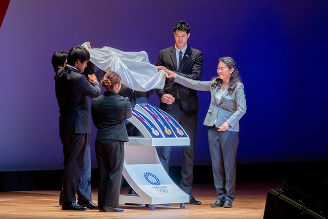 Following the torchbearer recruitment PR, the Olympic medal design announcement featured Ryohei Miyata, Commissioner of the Agency for Cultural Affairs (Chair of the Medal Design Review Committee), medal designer Junichi Kawanishi, and guest medalists: Homare Sawa (Women's Soccer), Takuya Haneda (canoe slalom), Hiromi Miyake (weightlifting), and basketball player Yuta Watanabe (NBA player).