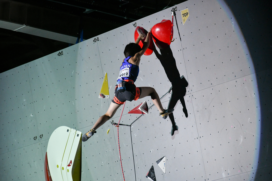 Fifteen-year-old Aya Moriaki, competing first in the final lead event, climbed the 15-meter wall flawlessly, drawing the loudest cheers of the day. Noguchi also put up a strong fight, reaching just one hold from the top.