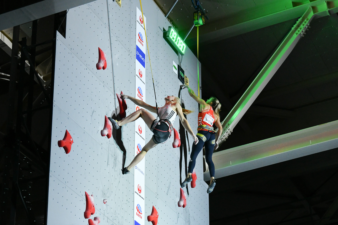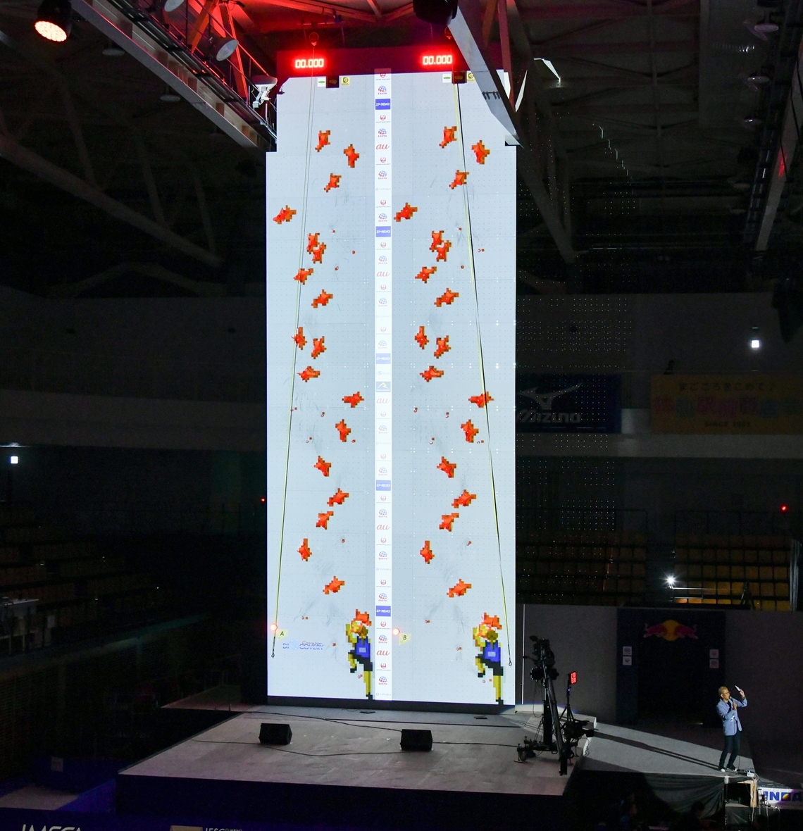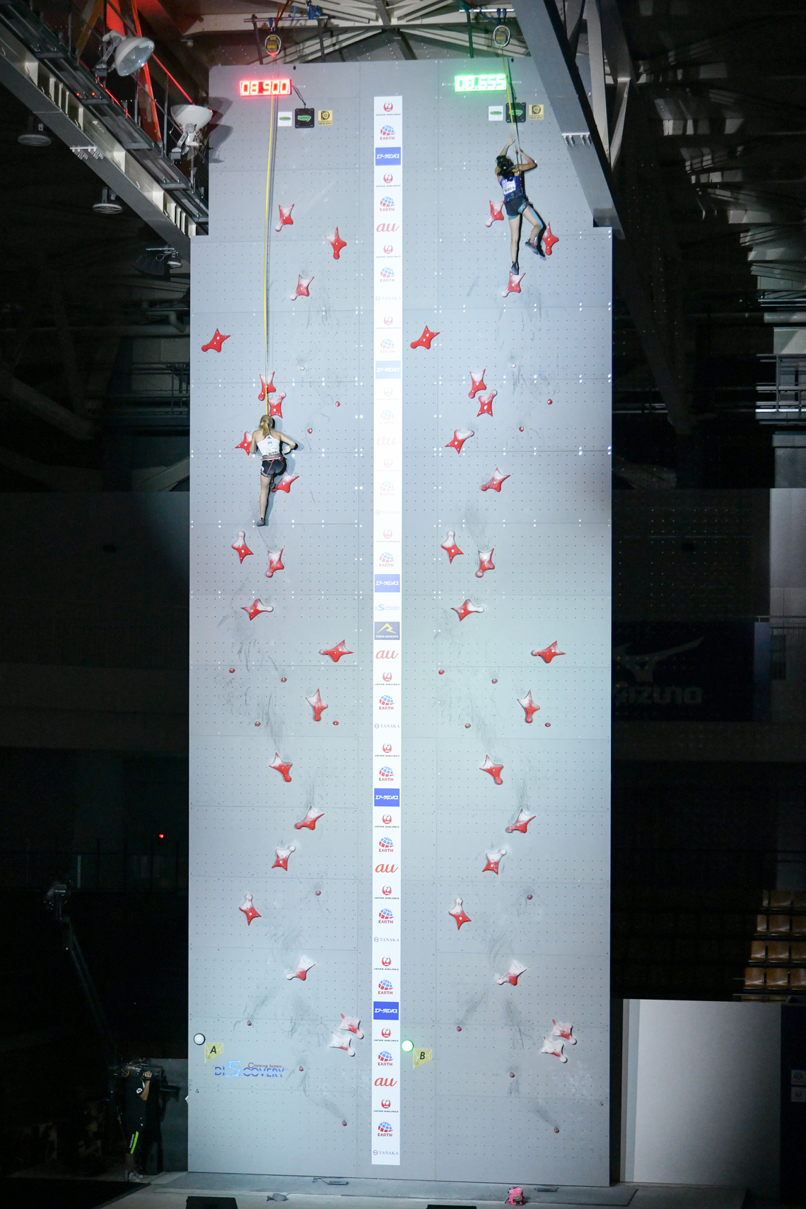In the speed event, two athletes start simultaneously, making the outcome clear. However, some athletes slip off the holds while leading, creating a mix of cheers and gasps from the crowd as the race to the top happens in the blink of an eye.