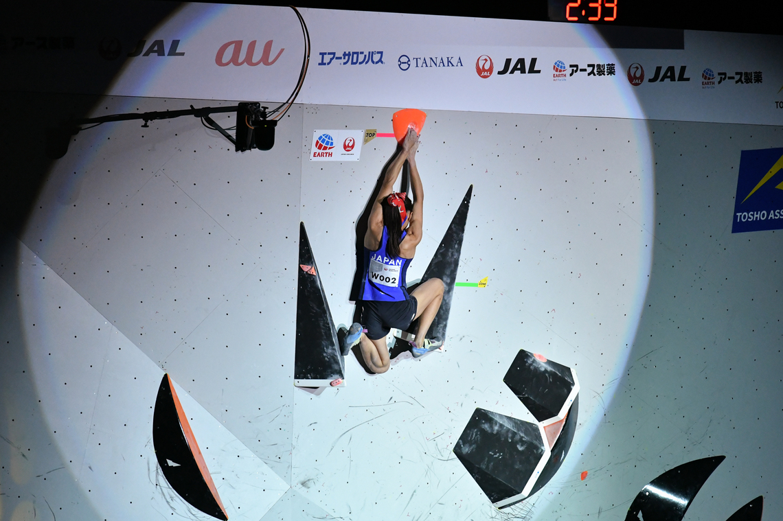 The walls featured overhanging sections, making completion exceptionally challenging. When athletes found themselves in difficult positions, loud cheers from the crowd pushed them forward. Noguchi was the only competitor to clear two problems, securing first place in this event.