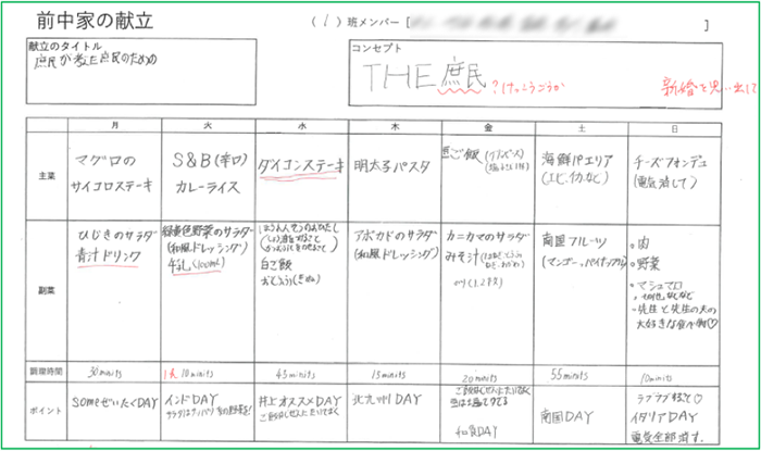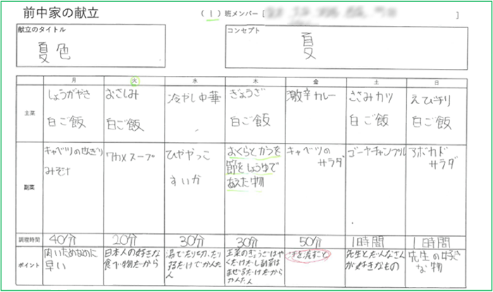 They interviewed the teacher, asked family members for simple recipes, and looked things up in books. They then added concepts and titles to the ideas they brought together and created presentation sheets. A few days later, the "Maenaka Family's Weekly Menu Presentation Contest" was held.