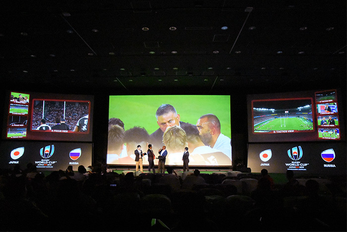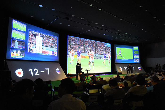 At the public viewing venue, sports commentator Tetsuya Sato, former Japan national rugby players Tatsuhiko Otao and Yuki Yatomi made appearances, providing unique commentary and analysis. Before and after the matches, the four of them, including the host, held talks introducing key points and players.