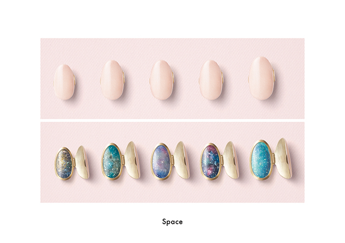 Playing on the word "NEWSPACE," imagine an infinite universe unfolding within the nail. Open the natural pink door, like your own nail, and a galaxy spreads out.
