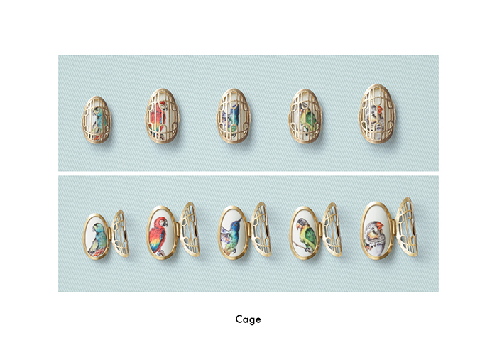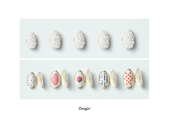 Opening the rice grain made of Swarovski crystals and pearl beads reveals the onigiri filling. From left: sesame seeds, salmon, plum, kelp, salmon roe.