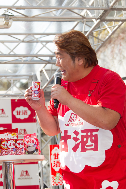 The company designated Daikan (the coldest period of the year, this year on January 20th) as "Amazake Day," recognizing it as the peak season for amazake consumption. On the day, celebrity Hidehiko Ishizuka (of the comedy duo Honjama-ka), the CM character for Morinaga Amazake, appeared wearing a fashionable outfit: short sleeves and overalls matching the amazake package design. He drank Morinaga Amazake and delivered his signature line, "Ah, that's warm~!" He handed out product samples to attendees, promoting the appeal of amazake for warming you from the core.