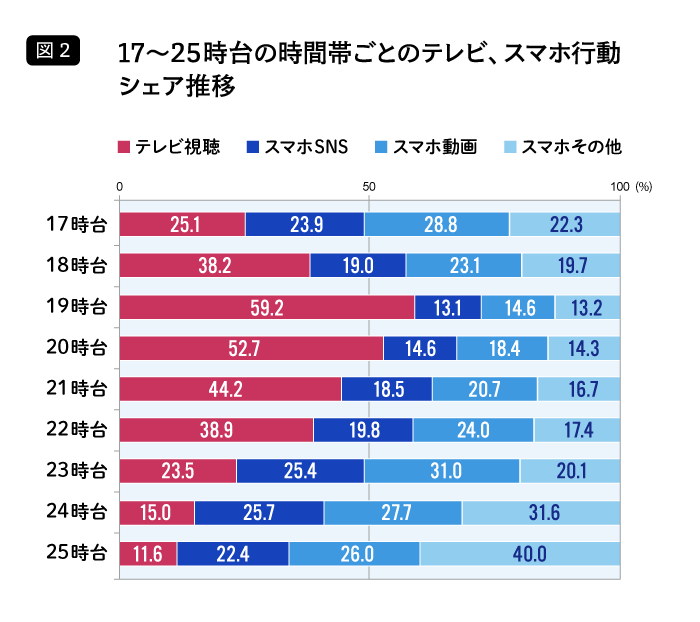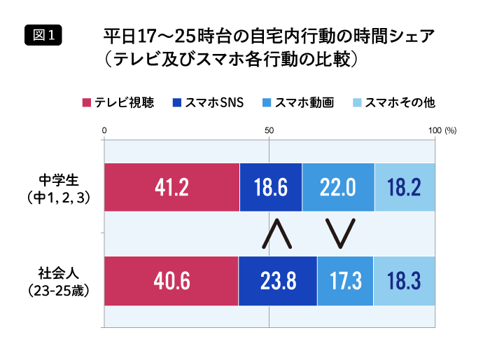 Now, please look at [Figure 1]. This shows the share of each media activity (① TV viewing, ② smartphone SNS use, ③ smartphone video use, ④ other smartphone use) when calculating the total minutes spent from 5 PM to 1 AM and summing them to 100%.