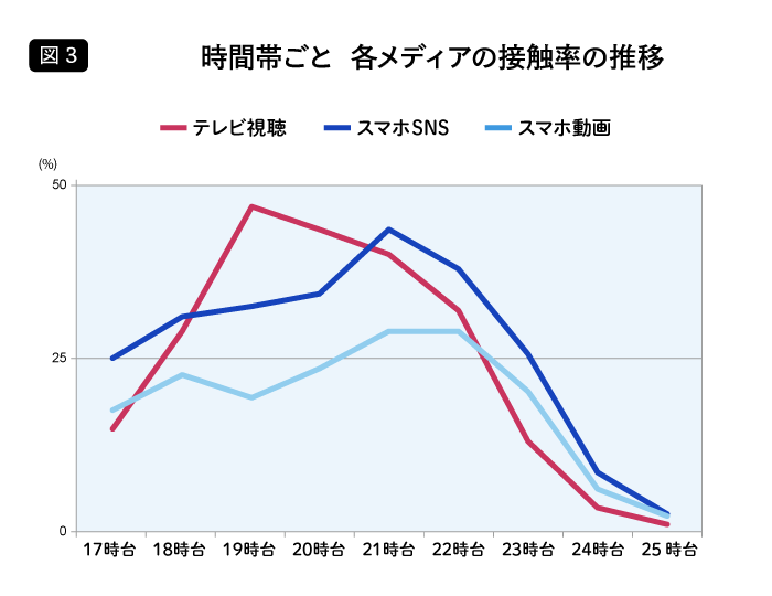 [Figure 2] shows the shift in the share of television and smartphone usage among all junior high school students by time slot, from 5:00 PM to 1:00 AM. According to this, television's share exceeds 50% and surpasses smartphone usage time, particularly between 7:00 PM and 8:00 PM (however, no adjustments were made for multitasking). While it's true that middle schoolers are increasingly turning away from television, it's clear that between 7:00 PM and 9:00 PM, television remains central to their information-seeking activities. This is further supported by the time-of-day contact rate trends shown in the subsequent [Figure 3].