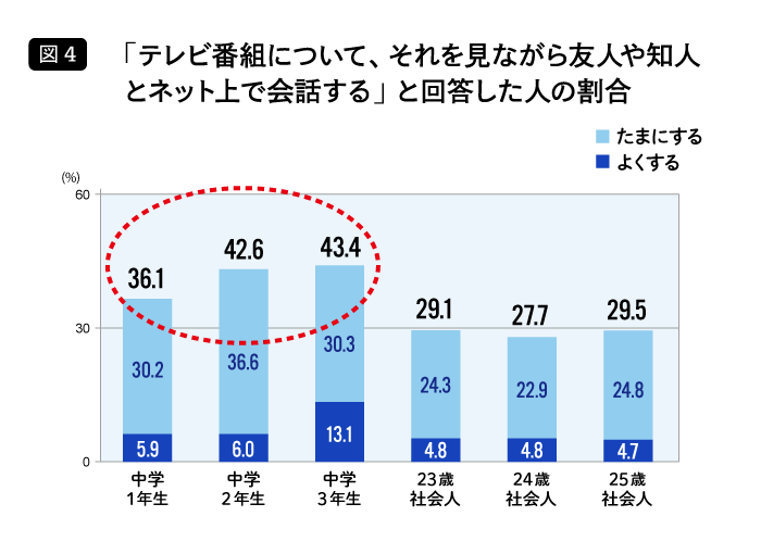 See [Figure 4]. This shows the percentage of respondents who answered "often" or "sometimes" to the item "Do you chat online with friends or acquaintances while watching TV programs?" The percentage of junior high school students who chat online about TV topics is higher than that of working adults 10 years their senior.