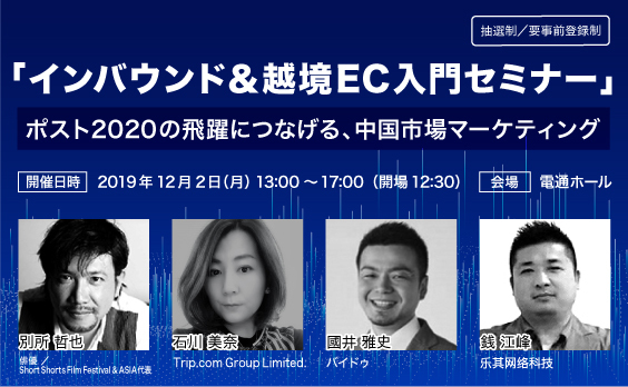 Sendenkaigi is currently recruiting participants for its "Inbound & Cross-Border E-Commerce Introductory Seminar: Connecting to Post-2020 Growth through China Market Marketing," scheduled for December 2 at Dentsu Inc. Hall in Minato-ku, Tokyo.