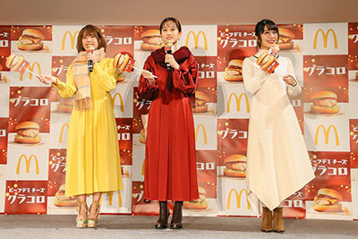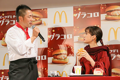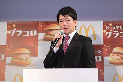 After receiving a product explanation from Senior Manager Shigeaki Wakana of the Menu Management Department, Maeda sampled two types of Gracoro alongside representatives selected from invited fan club members. She raved, "Delicious! You can really feel the attention to detail. The buns are sweet—I'd want to eat them on their own!"
