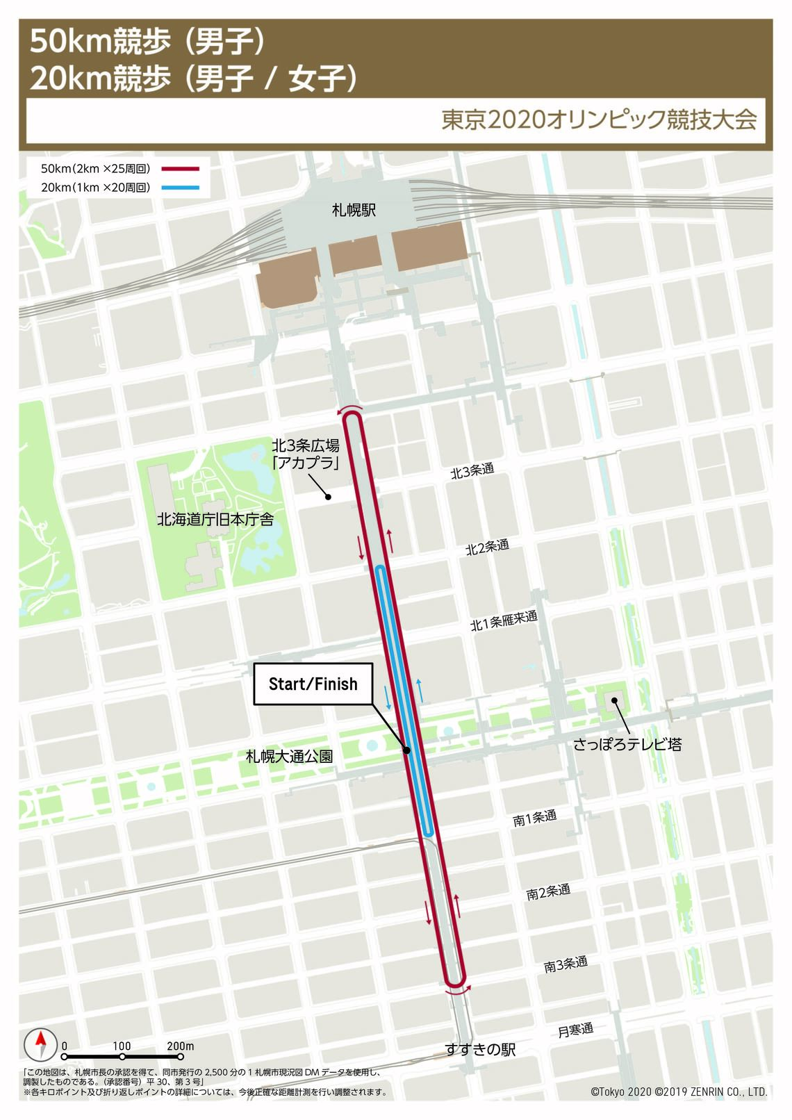 The racewalking events (held August 6 and 7) will utilize the north-south section of the station front street, which has sufficient sidewalk width to facilitate spectator cheering. The 20km racewalk (men and women) will consist of 20 laps of a 1km loop, while the 50km racewalk (men) will consist of 25 laps of a 2km loop.