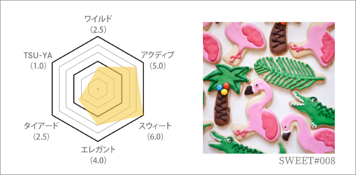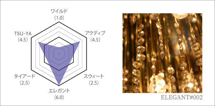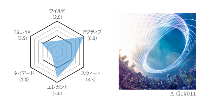 "WILD (Spicy)" represents a feeling of emotional frayed edges, while "ELEGANT (Moist)" embodies a sense of deep, soothing relaxation. "TSU-YA (Luster)" is a mode conscious of the opposite sex, while "SWEET (Sweet)" expresses a cute or fairy-tale-like mood. "A-Ge (↑)" is an active, elevated sensation, and "TIRED (Quiet)" is a compact, static mode.