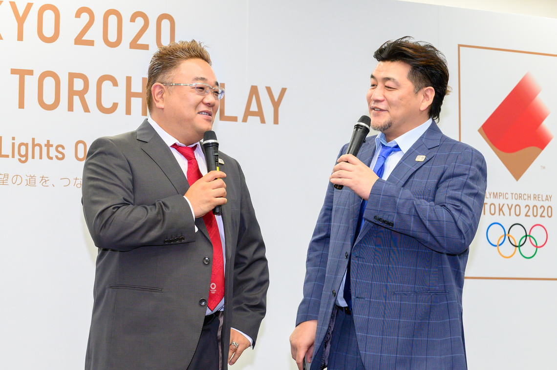 For the relay runner announcements, the official ambassadors for the torch relay, the comedy duo Sandwich Man, made an appearance. Representing the runners scheduled to run in Tokyo, they introduced players from the Chofu Little League Little Senior team and the attending members and coach of the "Nadeshiko Japan" team (the 2011 FIFA Women's World Cup Germany champions), who were selected as the Grand Start Runners.