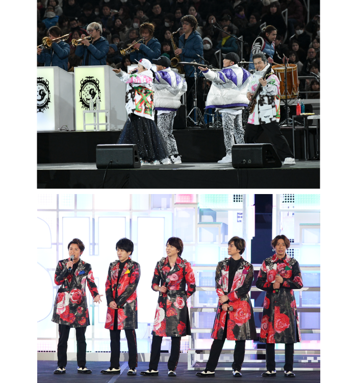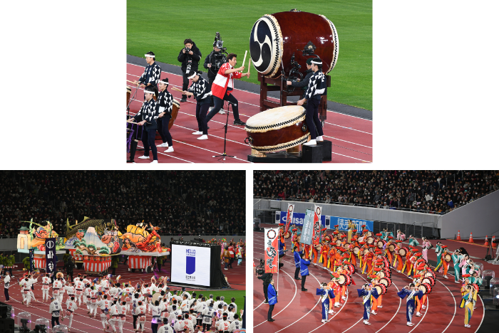 The music segment concluded with a dazzling performance by the idol group Arashi. Arashi holds the record for the most performances by an artist at the National Stadium. The five members rode around on specially designed trolleys, performing a special medley of "Love so sweet," "Happiness," "A・RA・SHI," and "BRAVE," sending the audience into a frenzy. The members commented, "This will be a lifelong memory," "It's thrilling to think that many legends will be born here," and "I believe it will become a place of aspiration for both athletes and artists."