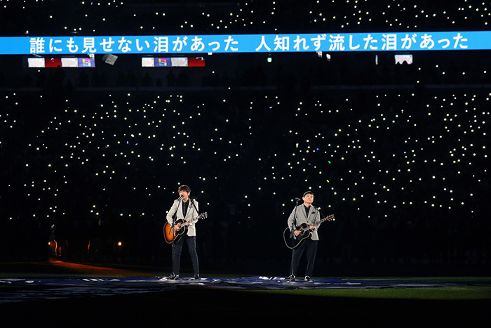 The second half kicked off with the first "Music Part" act: a special live performance by DREAMS COME TRUE (DCT). DCT passionately performed three of their hit songs: "Kessen wa Kin'yobi" (The Decisive Battle is Friday), "OLA! VITORIA!", and "Nando demo" (Over and Over). Yoshida Miwa addressed the crowd, saying, "Today, though it's a short time, I want to share this joy with you all. You are the opening babies of the National Stadium," drawing huge cheers. DREAMS COME TRUE became the second act in history, following SMAP in 2007, to perform a "National Stadium Live."