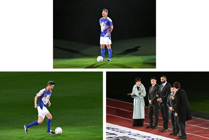 During the first "Sports Part," soccer legend Kazuyoshi Miura (J.League Yokohama FC) made his entrance under the spotlight. Miura, who holds the record for most goals scored at the National Stadium, wore a specially designed uniform based on his Japan national team kit and performed the important role of stepping onto the grass pitch for the first time.