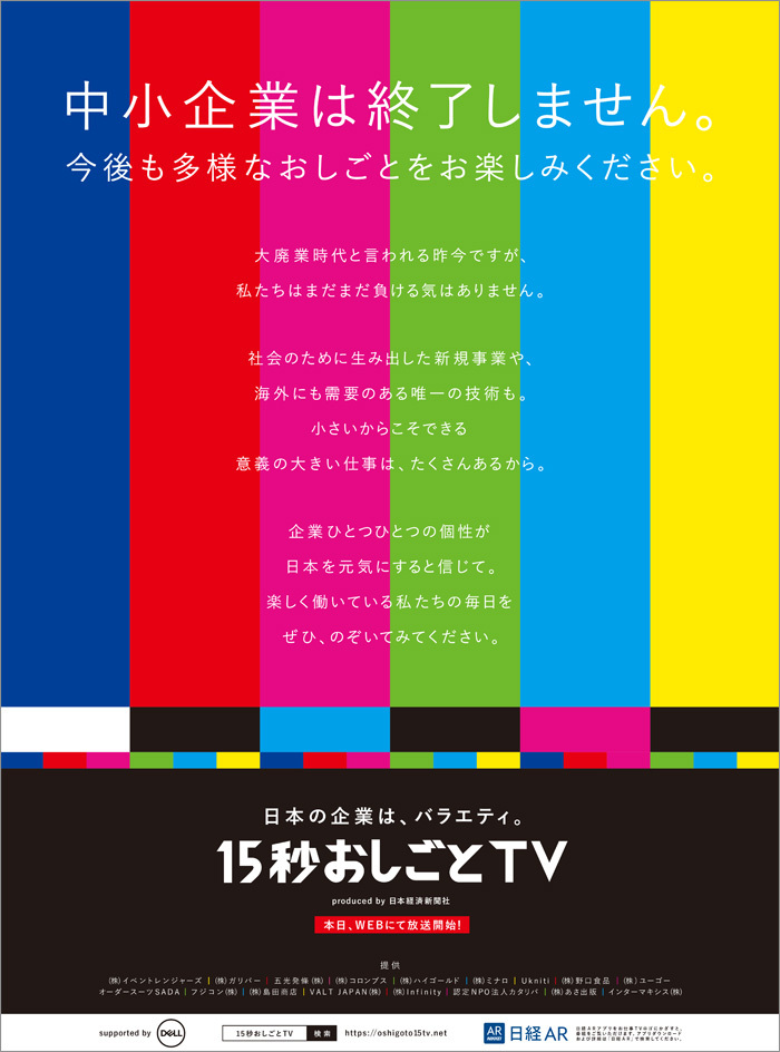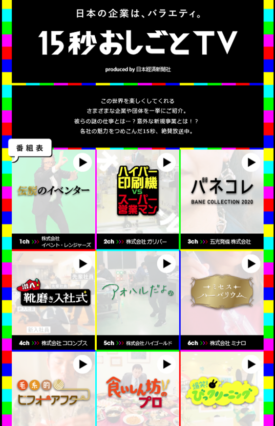 Released on January 6, 2020, " Japanese Companies: Variety. 15-Second Job TV " is a "new style recruitment advertisement introducing the appeal of 17 SMEs through 15-second videos." Its purpose is to visualize the unique spirit of each company and the work experiences available only there, supporting hardworking companies and organizations.