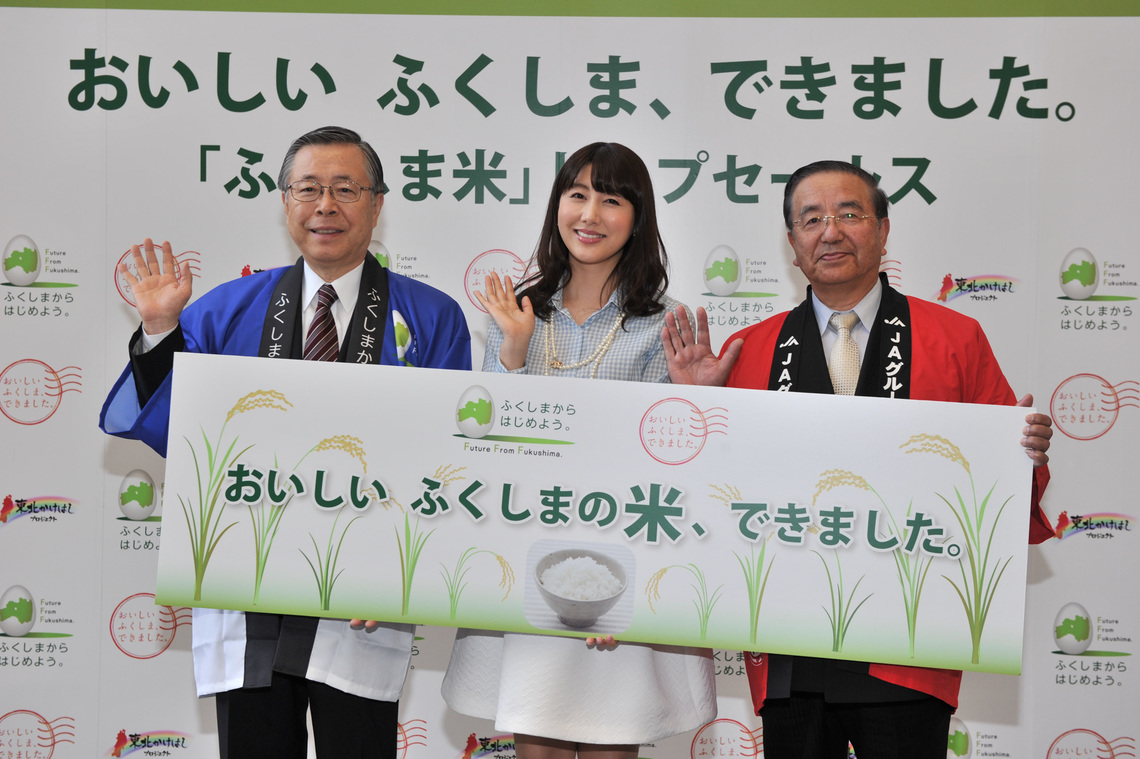 Guest talent Megumi Yasu (center in photo) offered encouragement, saying, "My husband is particular about rice, and breakfast is definitely rice. Fukushima and the Tohoku region have so many delicious things, so I want to support them." She commented on the Fukushima rice "Ten no Tsubu" rice balls, saying, "They have a nice chewiness, a sweetness that's still refreshing, and are very delicious."