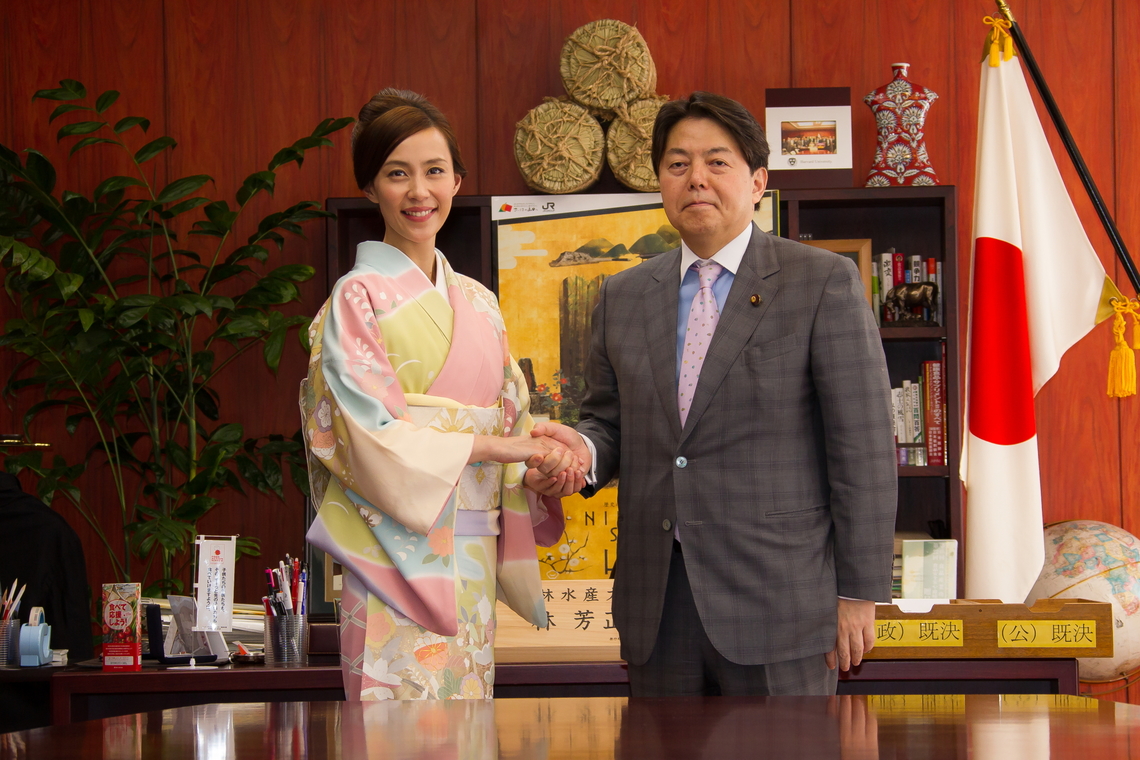 Prior to the press conference, actress Yoshino Kimura, the project's image character, paid a courtesy visit to Minister Hayashi along with six proprietresses from model inns participating in the project. Kimura remarked, "I haven't yet visited the Minister's home prefecture of Yamaguchi, so I'd love to go and try the delicious food there." The Minister responded, "There are many delicious foods not only in Yamaguchi Prefecture but throughout Japan. We want to spread Japanese hospitality to the world."
