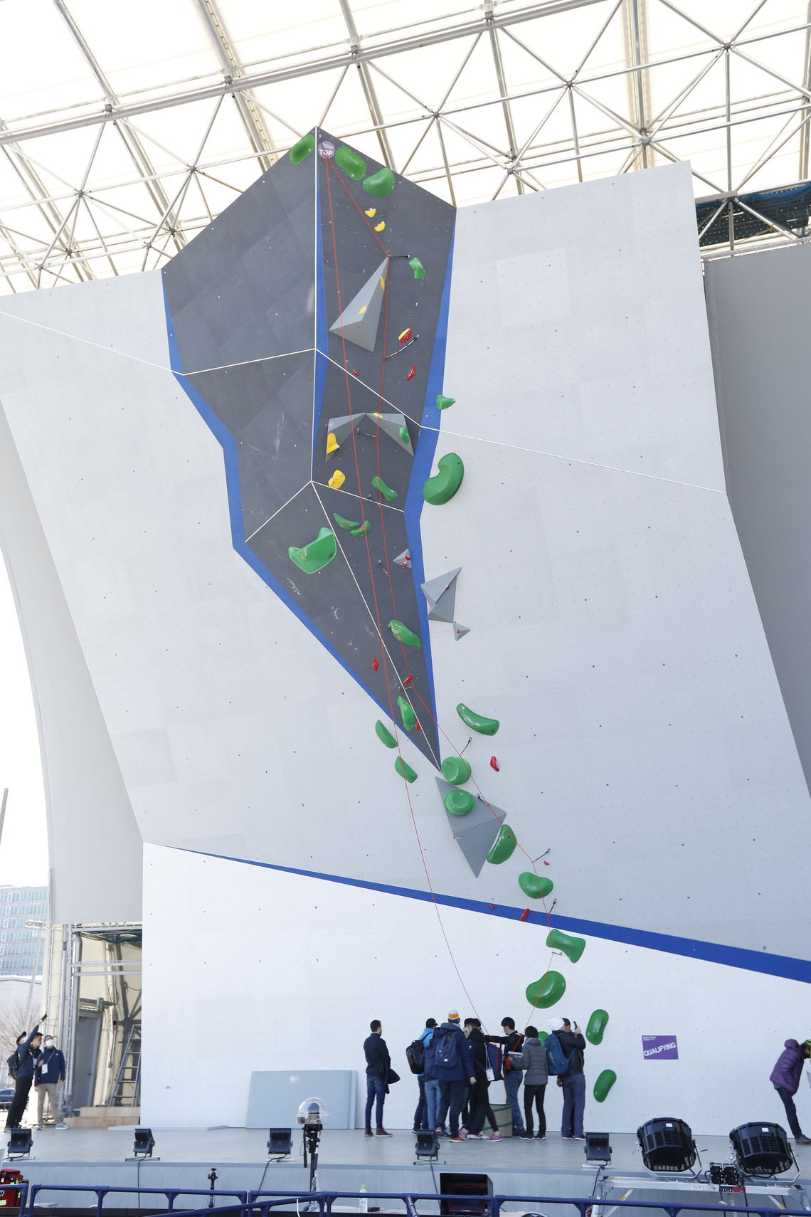 Lead climbing involves competing to see how far athletes can ascend a wall over 15 meters tall within a 6-minute time limit. For safety, athletes clip a rope into quickdraws (rope-holding devices) as they climb. Clipping the rope into the top quickdraw constitutes a "topout."