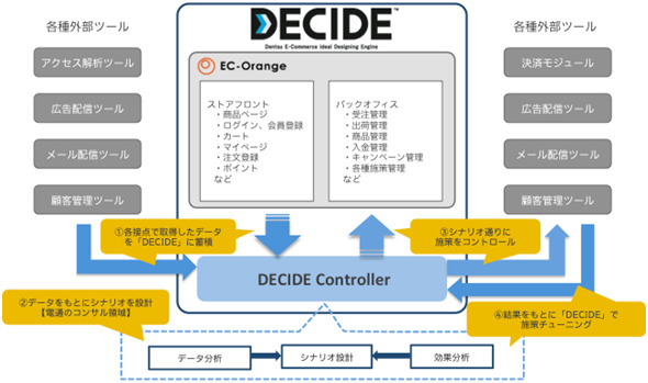 Based on S-Cubism's original EC package "EC-Orange," it acquires and accumulates data from various external tools. Based on scenarios created by the "DECIDE Controller" (one of the "DECIDE" modules), it automatically controls the selection and delivery of marketing initiatives.