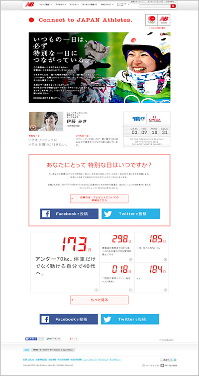 The campaign site features a roughly 30-second video titled "Countdown to a Special Day" starring Ito. Overlaid on footage capturing various expressions of Ito intensely focused on training are her own words: "I really want to win at the Sochi Olympics," "I want to see what lies beyond that," and "I want to enjoy every bit of that atmosphere and make it my day." The video conveys the message: "Every ordinary day inevitably leads to a special day."