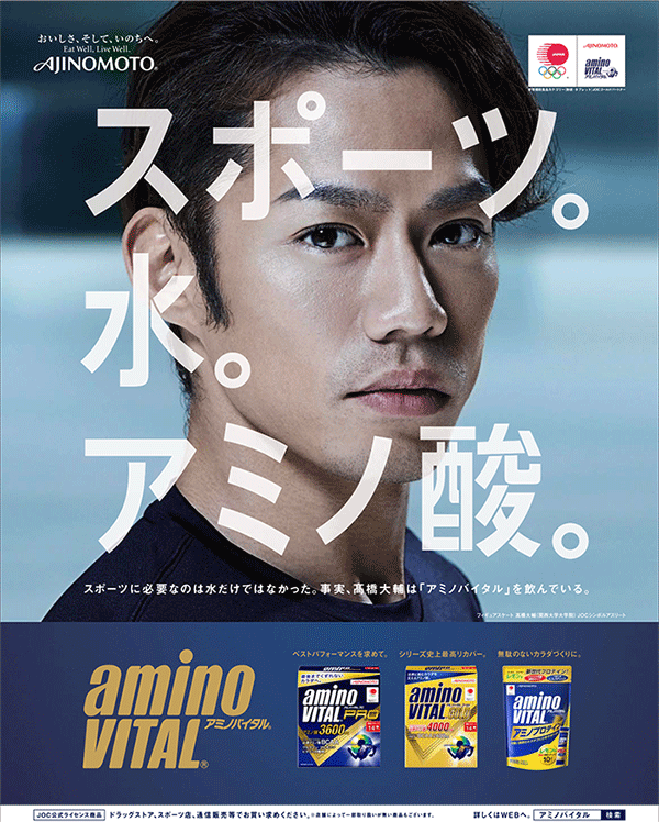 Additionally, magazine ads featuring Takahashi as the main visual are running with the tagline "Sports. Water. Amino acids." The Amino Vital website ( www.aminovital.com/tvcm/ ) also offers behind-the-scenes footage from the commercials.