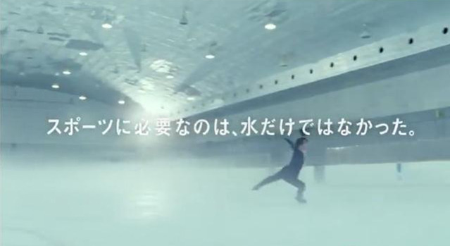 The "Amino Vital Daisuke Takahashi Interview" edition features Japanese men's figure skating representative Takahashi speaking against a backdrop of footage showing him practicing on the ice rink. He states, "Amino Vital is now common knowledge for athletes," and appeals, "I want many people to drink it and live each day energetically." The "Winter Sports" edition combines scenes of Takahashi's intense training with snowboarding and ski slalom competitions, asserting, "What sports require isn't just water," to emphasize Amino Vital's necessity. Timed for the Sochi Games, these commercials connect Japanese national team athletes and snow sports with Amino Vital, aiming to enhance the product's image and establish it as essential during sports.