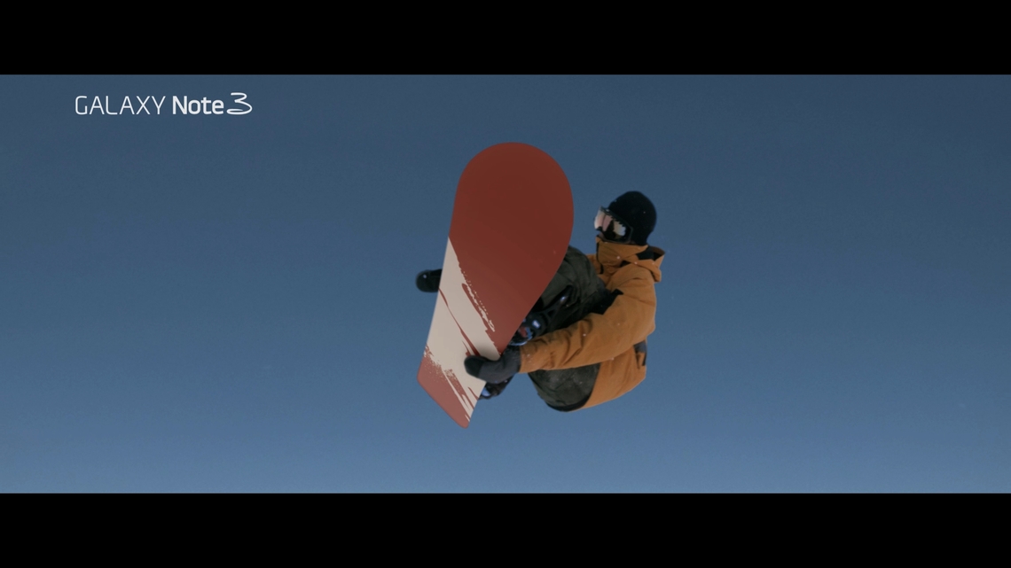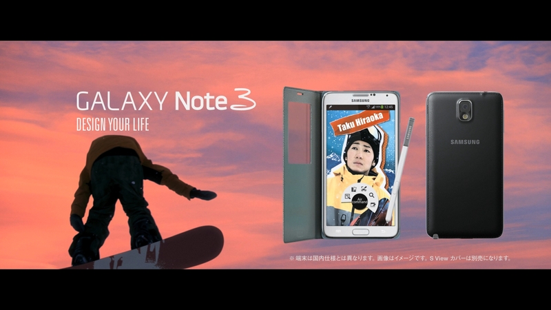 The TV commercial "NOTE YOUR DREAMS" features footage of Hiraoka riding while depicting snowboarders using the GALAXY Note 3 to joyfully pursue their dreams and goals. The device features handwritten note-taking for schedule management and making calls, as well as the ability to operate two apps simultaneously. The special website ( samsung.com/jp/note3/designyourlife/sports/ ) features the commercial and behind-the-scenes footage, plus special videos titled "MY STYLE" and "MY AMBITION" where Hiraoka discusses his personality and outlook on life.