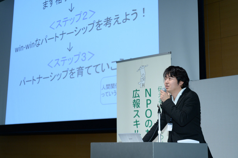 Keynote Talk ③ 'Steps to Collaboration' featured three speakers from Dentsu Inc. Social Solutions Bureau—Susumu Namikawa, Ryuta Taniguchi, and Nobuyoshi Kaida—examining relationship building between NPOs/NGOs and corporations. Namikawa delivered the keynote address. He began by defining collaboration as a two-way exchange of value. After introducing project examples he had handled as a bridge between companies and NPOs, he emphasized, "The achievements possible when NPOs connect with companies, organizations, and public institutions are significant. It's a waste not to connect." He organized "collaboration and cooperation" into a step-by-step approach: Step 1: "First, get to know your partner!" Step 2: "Consider a win-win partnership!" Step 3: "Nurture the partnership!" He then explained specific examples and answered questions from the audience.