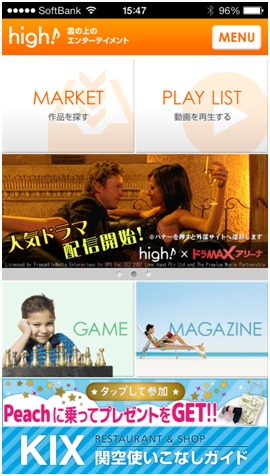 "high!" is a service enabling users who purchase Peach tickets to download movies, dramas, music programs, magazines, and games onto their smartphones or tablets using an app provided by My Theater. Aimed at making airport waiting times and air travel more enjoyable, trials began at Naha Airport in October 2012, with the service area expanding to Kansai Airport in March 2013.
