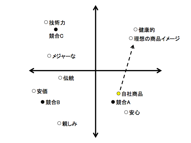 For example, it can instantly convey something like: "Analysis of our product's image showed it closely resembled major competing brands. Let's shift towards the 'healthy' direction consumers desire." Here, little attention is paid to "How do we shift in that direction? (i.e., how do we fight?)" The key is simply to become "healthy."