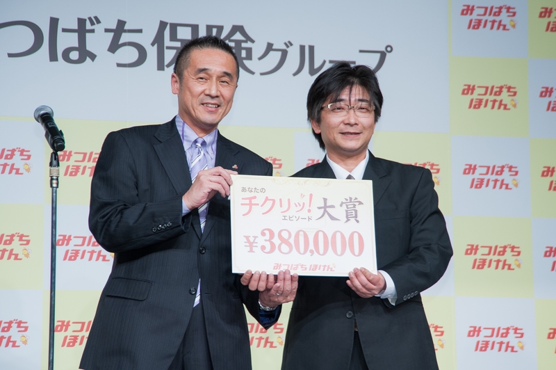 The grand prize went to: "I cooked a special meal for my dog, wishing him a long life. When I came home saying 'I'm back,' he just microwaved his food. 'I got a little jab at my wife, who's kinder to our dog than to me!'" The winner, Tetsuya Sato from Chiba Prefecture, received a prize of 380,000 yen (380,000 yen) and a trophy shaped like a bee's stinger, fitting the company's theme. Sato remarked, "I just submitted something from daily life. Last night was just like the entry," prompting laughter throughout the venue. The commercial can also be viewed on the company's website ( mitsubachihoken.com ).