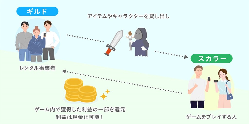 To address this issue, the second model, the "Scholarship Model," was created. This model allows players to rent NFT items or characters developed by other players. Players who rent items to play are called "Scholars." Scholars pay a portion of the rewards they earn to the rental provider, the "Guild." Guilds are operated by decentralized autonomous organizations ( DAOs ), which lack a central authority. The key feature of the Scholarship model is this mutually beneficial revenue structure between Guilds and players.